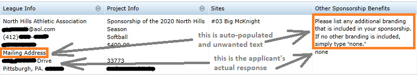 For example, there is a field on one of our application forms that says: "Please list any additional branding that is included in your sponsorship. If no other branding is included, simply type none." When I run the coordinating report, my "other sponsorship benefits" column includes the applicant's input to this field but it ALSO includes the exact text from the application form ("please list any additional branding...").