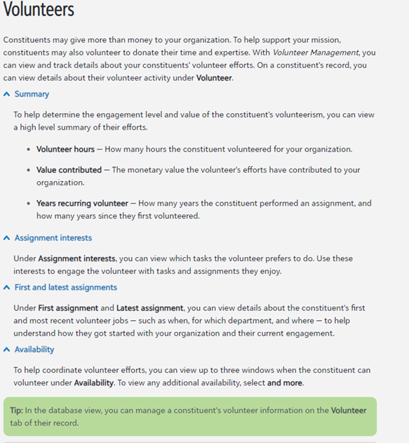 1. Make visible in NXT the info listed in the general/volunteer types area from the Volunteer tab in the database view