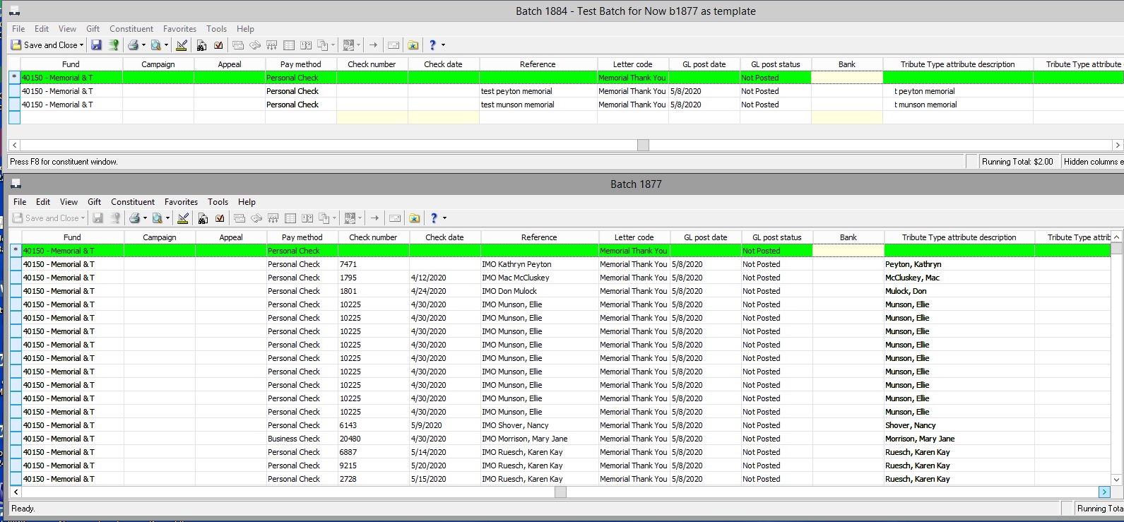 We use the tribute module constantly. Once you know how to use it (they don't make it easy) then it really does help you to keep track of tributes, etc. I have attached some screen shots of the batch “set up” we use. Hopefully this will help. If not, e-mail me pjohnson@mercycare.org and I can try to walk you through it. I'm new too, but I have been taking tons of classes.