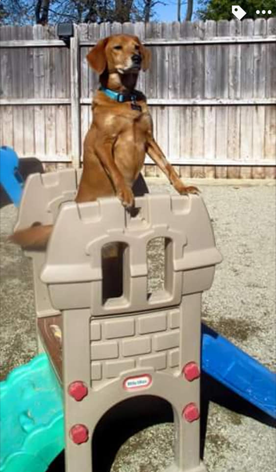 This is a picture of my dog Jessie when she was at doggy daycare one day. She has been raised with cats and has no clue how to act like a dog or what she should do around other dogs.1