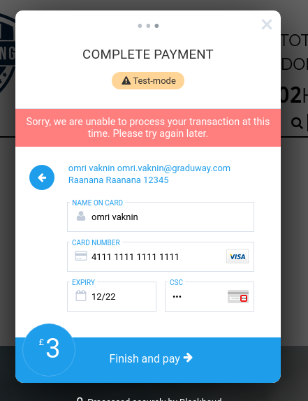 I get an error message: "Sorry, we are unable to process your transaction at this time. Please try again later." after I try to 'finish and pay' in the checkout form on test-mode, what is the problem?