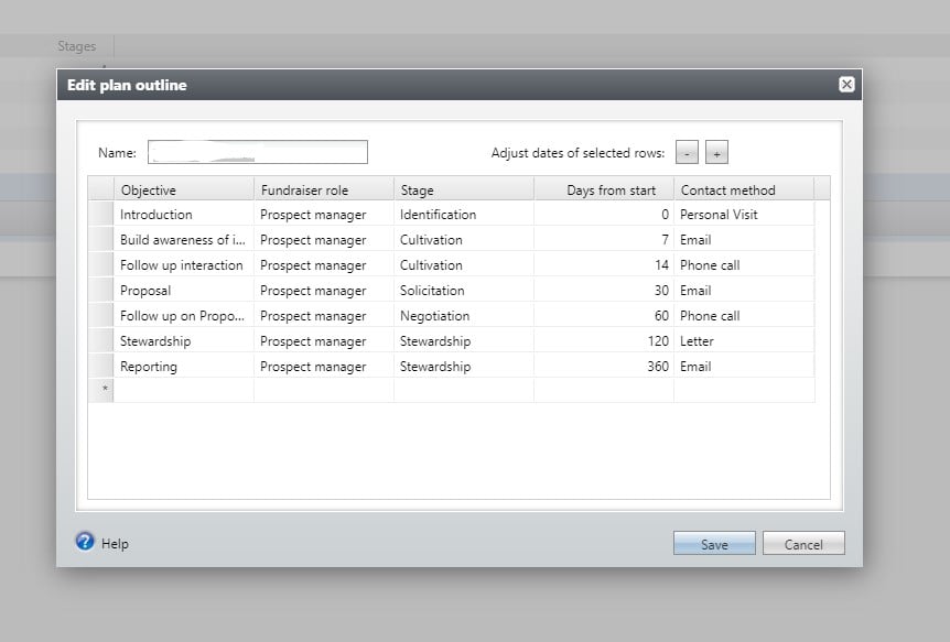 The most customization comes in with the dates, especially as timelines shift, so they are basically placeholders. I'm no expert, but the Prospect Management extension has been one of my main tasks in Altru this year, so feel free to reach out if you ever need to work through things!