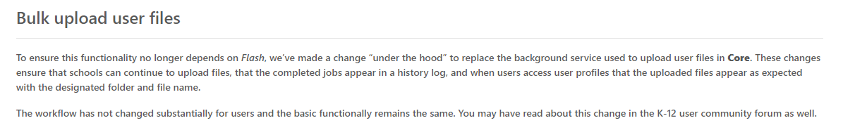 Good news - we're down to the wire but we are working on a replacement for Bulk upload user files that will either be released Dec 22nd or the first opportunity in January. Sorry we didn't call this out in our Q4 product update.I saw the Flash removal information on the December 15th release notes earlier this week (Monday), but it was removed. So this is definitely happening in the final hour?