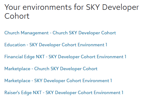 - The SKY Developer Cohort – If you do not have access to your own Blackbaud environment, you can request access to the Cohort sandboxes.