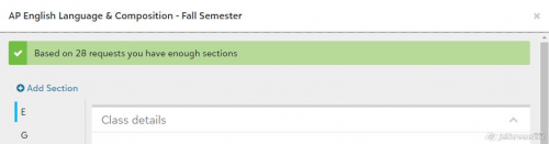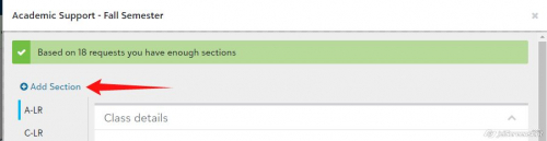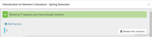 This is what I have -- but I was trying to add the section for second semester. After I looked at your screenshot, I went back and looked at this course for first semester, and I DO have the "Add a section" button in first semester. SO, I guess that even though I don't need the additional section till second semester, I should just add it to first semester and it should carry over into second semester. Thanks for helping me work through this! And I wonder why I can add a section to the semester that's almost over but not to the semester that hasn't begun yet? That's a question for another day. Thanks again!