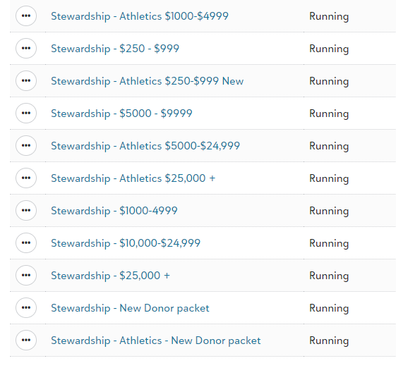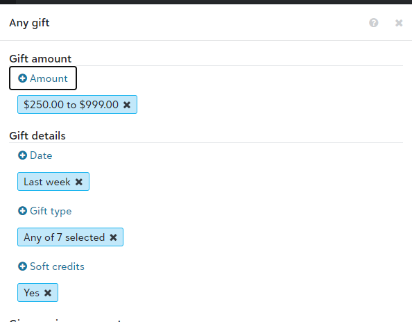 The workflows are driven by lists. I just used a gift list and used the time frame of "Prior week" and the gift amount range. You have to have a different list for each workflow.0