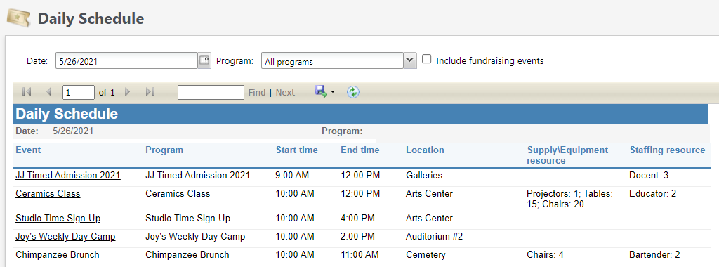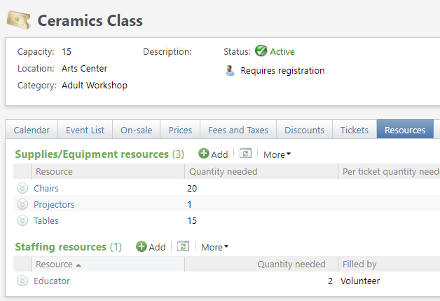 You are able to assign staffing resources to your art and drama classes. I've included some screenshots below. From Tickets > Resources, you can add staffing resources. From the Scheduled Program or Preregistered Program record, you'll go to the Resources tab and you can plug in how many Instructors you'd like for that program. As you go to add scheduled program events, those instructors will get assigned to those events. From the specific event record (ex. Ceramics Class on 5/26/21 at 10AM), you can actually assign staff members to the specific events you'd like them to cover.