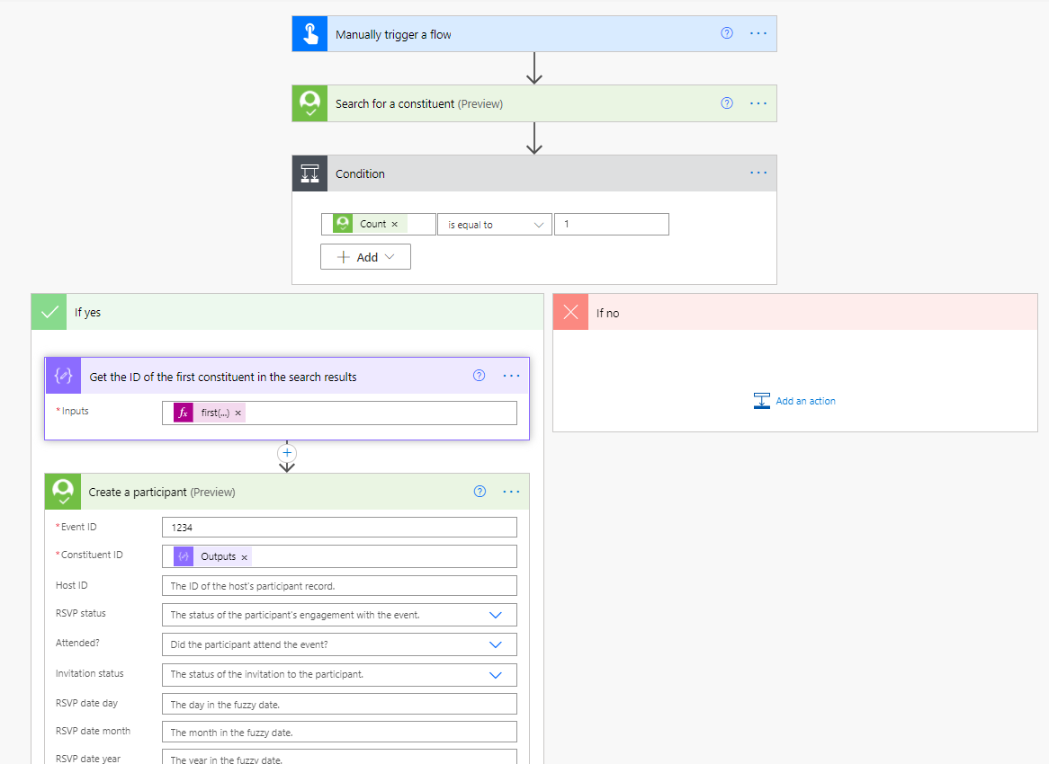 Since the search returns a list of matches, you'll probably want to express what should happen if no results (or multiple results) are found. In my example below, I'm only taking an action (creating a participant) if a single result was returned by the search action (meaning, the Count property of the response is 1):