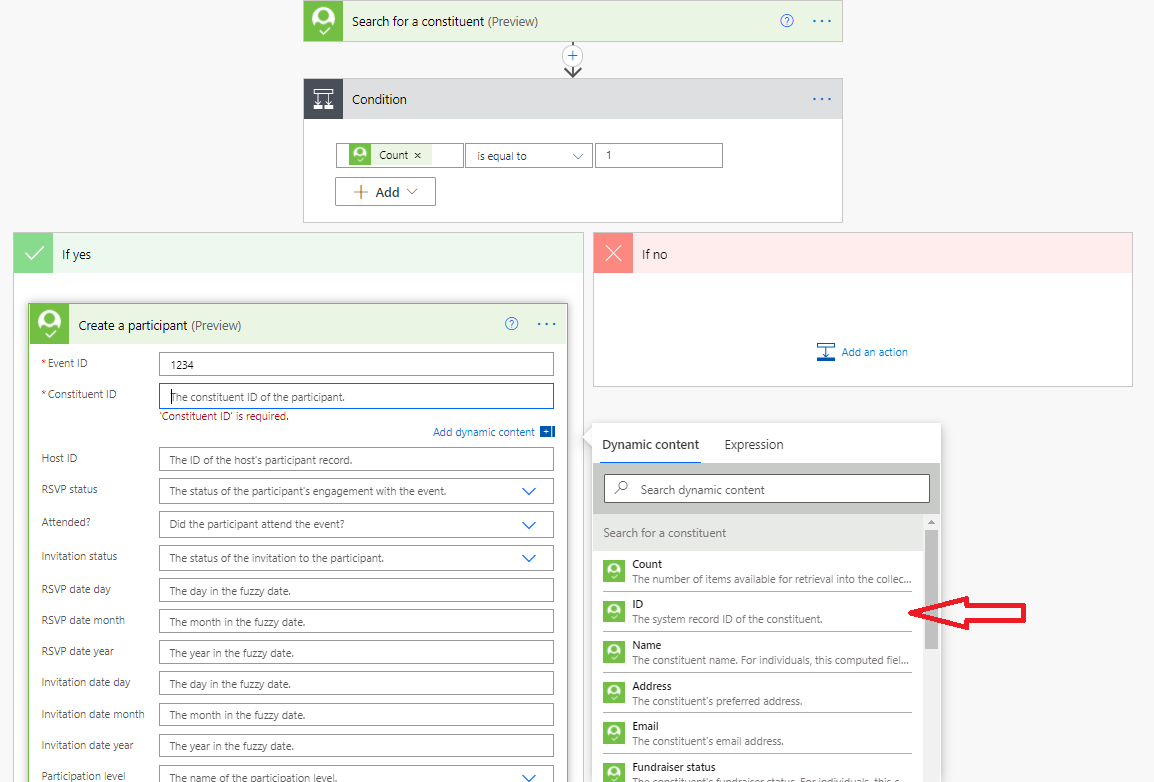 first(outputs('Search_for_a_constituent')?['body/value'])['id']That expression takes the first item of the value property of the search result action, and then returns the id property.