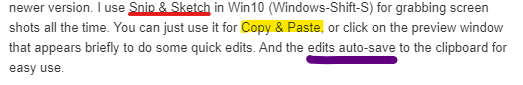 I use Notepad++ for everything. It's editing routines are great (CRTL-click in multiple locations, ALT-select to grab columnar areas, etc.). I also use SnagIt, but I do have the newer version. I use Snip & Sketch in Win10 (Windows-Shift-S) for grabbing screen shots all the time. You can just use it for Copy & Paste, or click on the preview window that appears briefly to do some quick edits. And the edits auto-save to the clipboard for easy use.