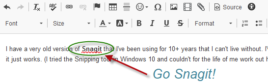 I have a very old version of Snagit that I've been using for 10+ years that I can't live without. I've tried newer versions of Snagit and couple of other screen-grabbing utilities but this one is so easy, dependable, light-weight and ... well, it just works. (I tried the Snipping tool in Windows 10 and couldn't for the life of me work out how it was supposed to work, where it put snips, etc. I ended up losing a whole swath of code sample images. Probably should have read the manual, tho.)