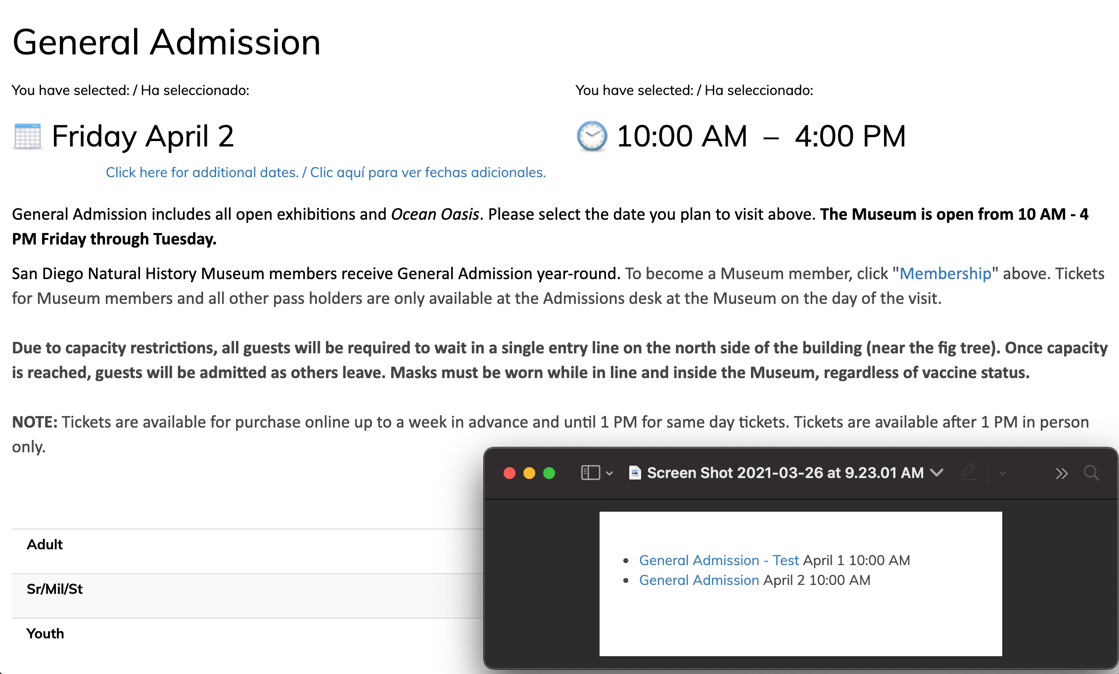 We're not doing timed ticketing, so you won't see the "other times" option in the screenshot, but we've always used Scheduled Programs for our GA program so that it's always had a day attached to it.