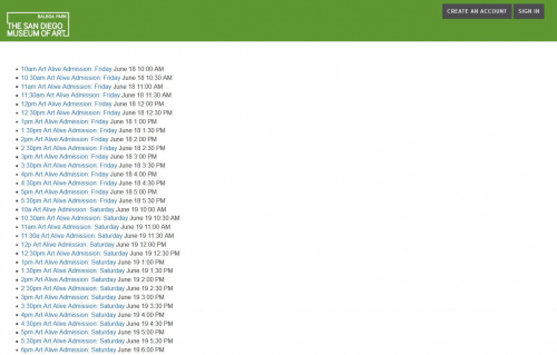 We are attempting to make a timed ticket sales page for an Annual Event named Art Alive. In order to limit the amount of visitors in a given time, we have separated all of our ticket times into separate links. At the moment, if we were to link our "buy tickets" button, it would lead to a page that looked like this: