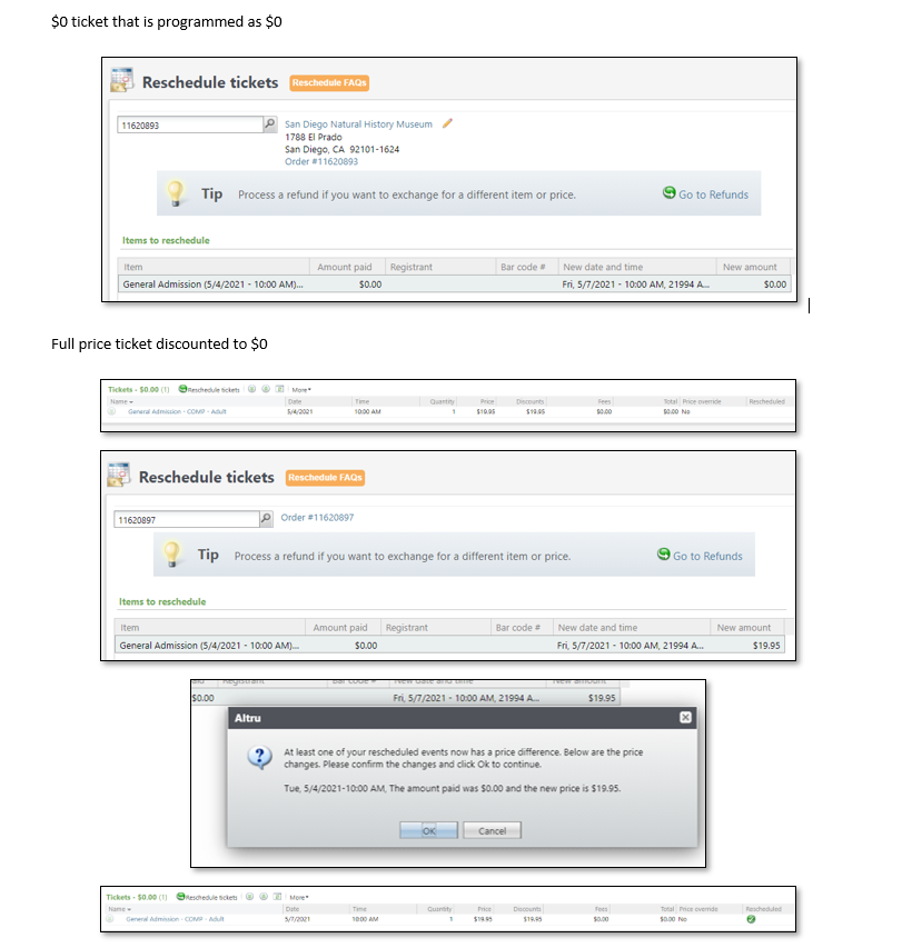 That said, I did want to jump in to share that $0 tickets and discounted tickets can be rescheduled for those that have commented that they are rescheduling (but having to do a refund/new sale) if you are keeping the same discount on the new date. For discounted tickets, Altru will tell you the amount paid and that the new price is the original price, but when you click "OK" it'll complete the reschedule without requiring payment. The order will still show the discount. I've included a screenshot of both below.