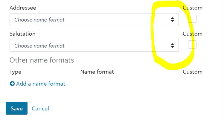 Under Other name formats, you can view any additional addressees and salutations, such as for the various types or tones of a communication: