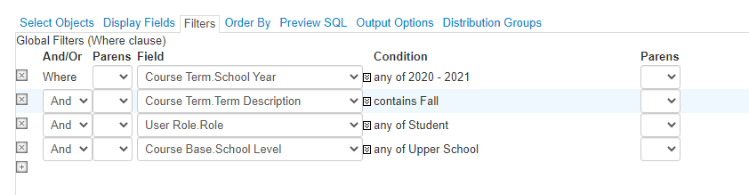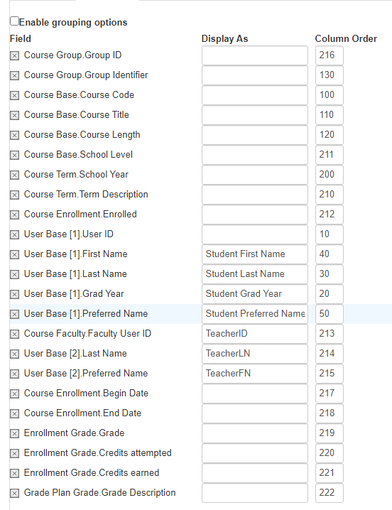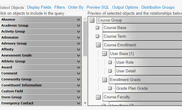 Few examples of fields I need are: CourseCodes and Credits a student has taken, course ClassSections, Start and End Dates, Marks and Earned Credits.