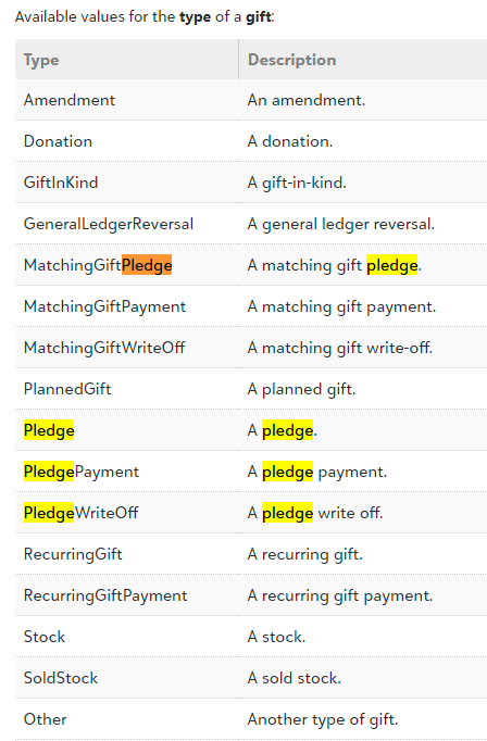 The documentation that I reviewed and at that link has “Pledge” as a gift type…..
