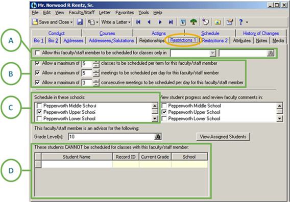 - If the teacher works in multiple schools, follow this process to prevent scheduling conflicts: (1) Assign the teacher to classes in one school, (2) enter the assigned times as restrictions for the other schools on the Restrictions 2 tab of the faculty/staff record, and (3) assign the teacher to classes in the next school.
